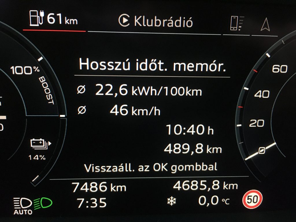 Egyenáramú töltőn legfeljebb 11 kW-tal tölthetjük, így nem sok Lidl, vagy Penny parkolóban látunk majd Audit, az otthoni töltés majdnem két napig tart hagyományos konnektorból.